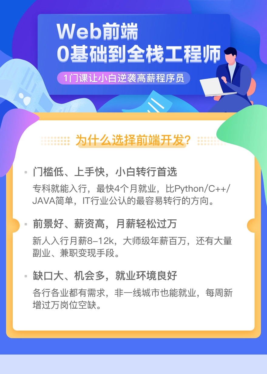 HTML、JavaScript、jQuery、h5c3、es6、nodejs、git、webpack、vue、react、微信小程序、前端面试题,typescript,前端面试指导等为一些学员解决不知道要学习哪些知识的难题。课程咨询联系客服。
